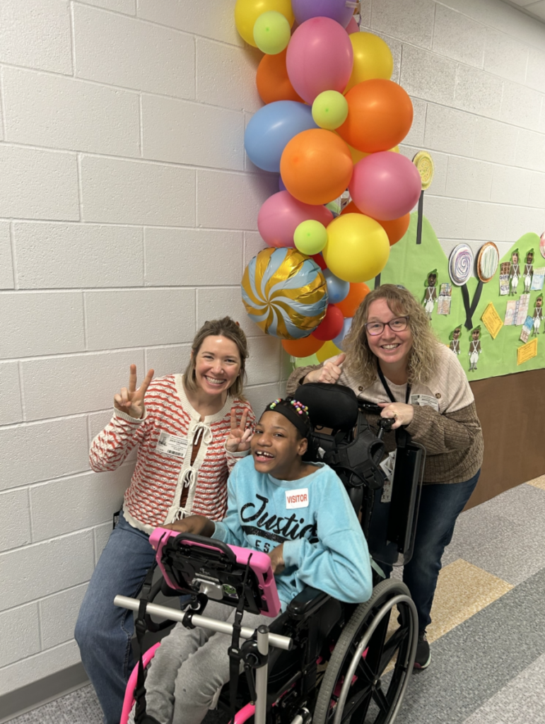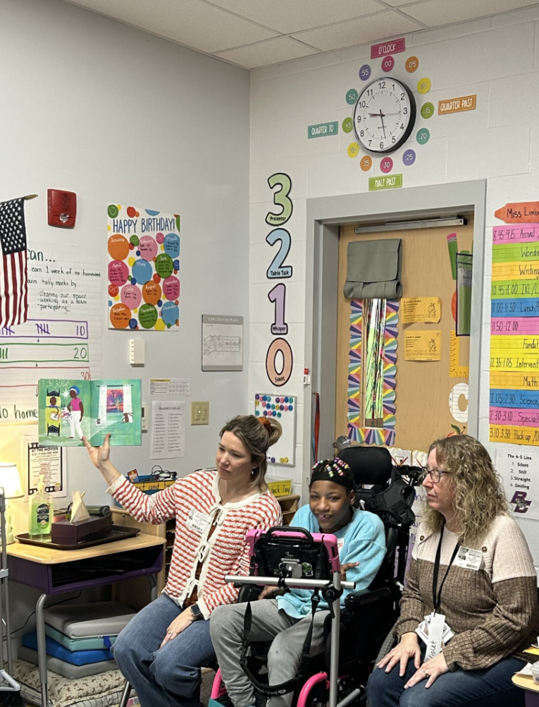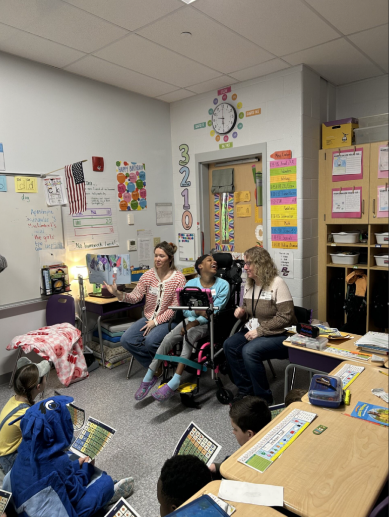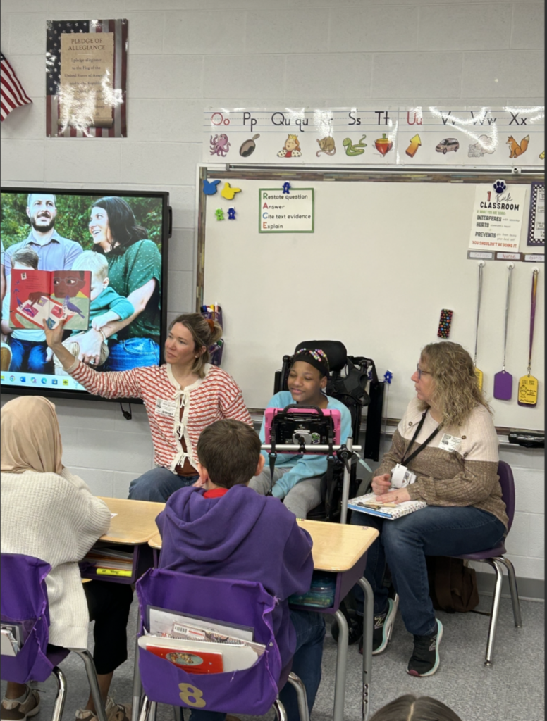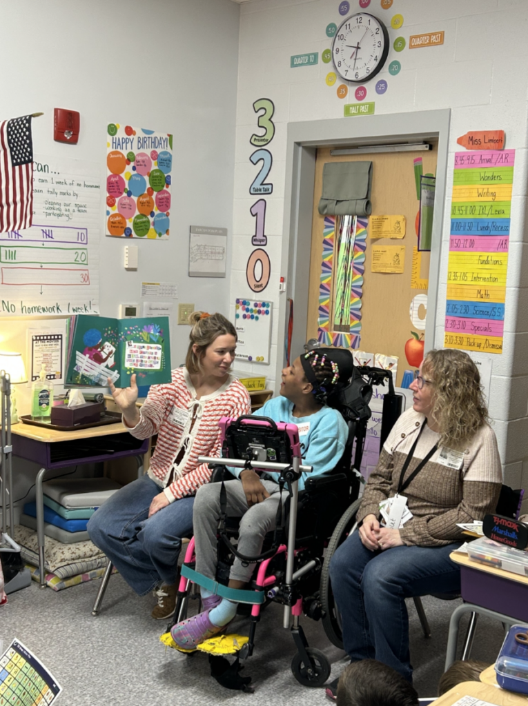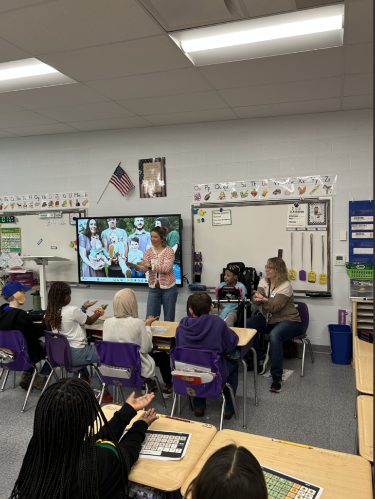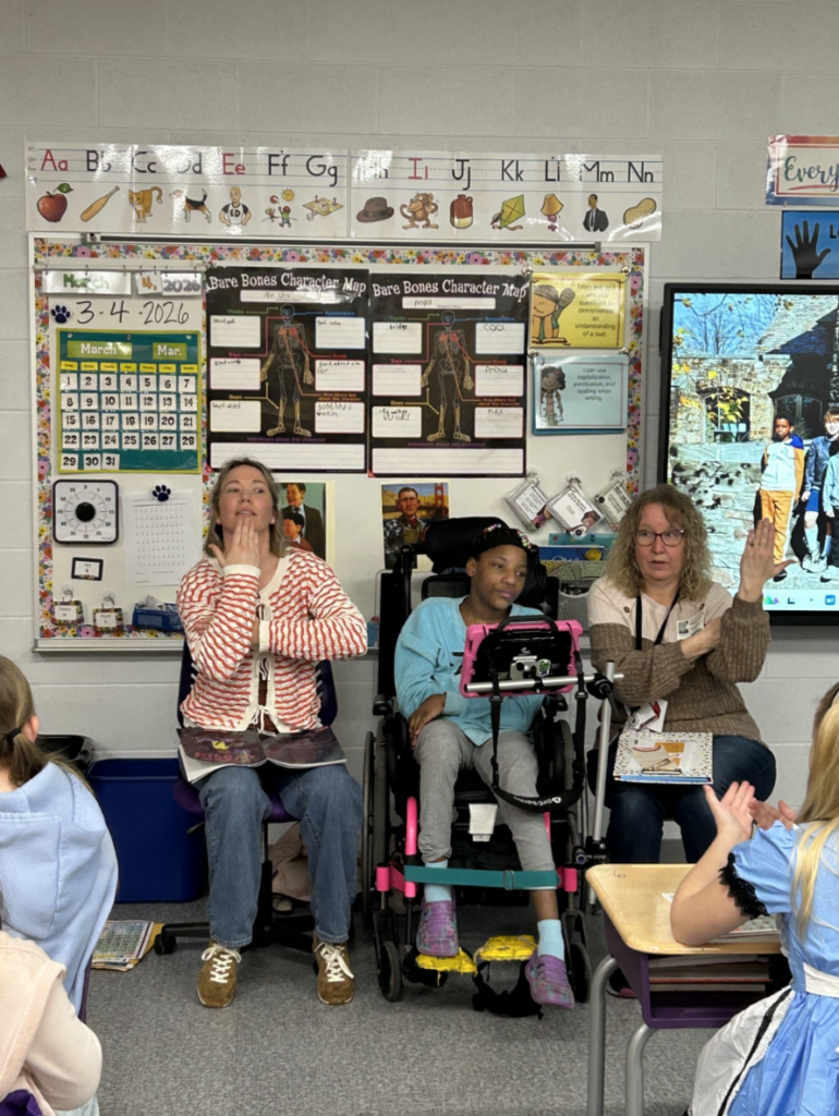 During the Q&A that followed the book, My’Only confidently called on students and answered their questions, especially relishing the chance to share her recent birthday. Her presence sparked curiosity and thoughtful conversations among the students. Her teachers, Julia and Angie, asked the class to imagine what it might feel like to go a whole day without speaking. Many students shared that they would feel frustrated or upset, which opened the door to a meaningful discussion about why tools like AAC devices and sign language matter.